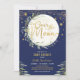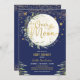 Moon & Stars convite temático com elegante cor d'água verde e lua sonhada e elementos estelares colocados sobre um fundo azul-marinho moody