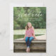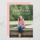 Convide convidados para comemorar o formando com nossos convites de festa de formatura de Sobreposição de Script Elegante de tendências. A frente dos convites mínimos para festas de formatura exibe a foto favorita do formando com "formando" em branco e o nome do formando, escola e ano de graduação abaixo. A parte de trás dos convites apresenta "comemorar o formando!" com os detalhes de sua festa mostrados abaixo em texto preto sobre um fundo cor-de-rosa pincelado.