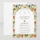 A sophisticated botanical design featuring rich green foliage and soft ivory blooms, framed within a timeless arched layout. The deep, nature-inspired tones bring a sense of depth and refinement, while the clean typography keeps the overall look elevated and effortless.