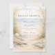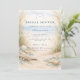 A refined coastal bridal shower design featuring an elegant oval wreath of seashells, oyster shells, starfish, and soft sea glass accents. Neutral sandy tones blend with muted ocean blues and delicate dune grasses to create a serene seaside aesthetic. The airy parchment background enhances the natural textures while maintaining a graceful, elevated look. Perfect for a beach-inspired celebration with timeless coastal charm.