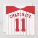 Personalize a parte de trás do convite com sua escolha de nome e número de camisa (idade). A frente do convite está no estilo de uma camisola de basebol, completa com design de colarinho e riscas. Você pode alterar a cor do plano de fundo e clicar em 'PERSONALIZAR'.