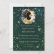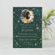 Sol e lua de ouro celestial, flores e estrelas sobre fundo verde.