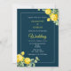 Lindas e elegantes rosas amarelas de arte floral e verde nos convites amarelo e azul marinho. Tão bonito que você pode quase cheirar essas flores; uma escolha excelente para casais que procuram por algo com um olhar elegante.