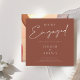 Estamos envolvidos no convite para Noivado Foto Terracotta Simples. Anuncie com firmeza a sua noivado aos seus amigos e família com este simples mas elegante convite para festas de noivado 'Estamos noivos', com um design de guião branco minimalista sobre um fundo laranja comum queimado, com uma foto personalizada de vocês dois atrás. Este noivado dá uma sensação moderna e minimalista, perfeita para qualquer casamento simples e elegante. Este convite de noivado mínimo e aterrador irá dar o tom para qualquer simples e subestimado cenário de noivado de casamento rodeado por delicadas decorações e flores, e combinando com a decoração de casamento de laranja queimada ou ferrugem. Uma adição perfeita a qualquer celebração de casamento simples, mínima ou rústica. O Coletivo de Domingo © por Rachel Hannah Gee