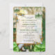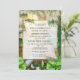 Cenário de fantasia de casamento real, branco e azul-esverdeado, num templo tropical rodeado de verde com decoração moderna de joias de penas de ouro. Cartão de personalização para personalização