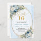Celebrate a milestone moment with this elegant Sweet Sixteen invitation, featuring a refined watercolor design of dusty blue florals blended with soft white flowers and fresh eucalyptus greenery. Framed by a shimmering gold glitter border and paired with graceful script lettering, this invitation sets a sophisticated tone for a truly unforgettable Sweet Sixteen, Sweet 16th, or 16th birthday celebration.