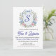 Elevate your next sophisticated garden gathering, ladies' luncheon, or bridal shower with this exquisite, watercolor-illustrated invitation. The design features a delicate light blue and pink floral wreath composed of lush hydrangeas, roses, and lush greenery, centered around a classic watercolor crest shield. At the top of the crest sits a charming light blue ribbon bow.