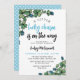 O convite ao chá de fraldas do menino com trevo azul de quatro folhas com um pequeno encanto de sorte está a caminho num roteiro encantador com ilustrações desenhadas à mão de quatro capas de folhas e flores azuis do trevo. Dia de São Patrício de chá de fraldas com capas de sorte, flores e fontes encantadoras.