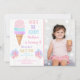 Este convite bonito apresenta um cone de sorvete e balões em cores pastel do arco-íris com faux gold foil confetti.