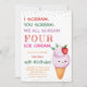 Celebre o quarto aniversário do seu filho com um convite fofo e trendy de cone de sorvete! O convite apresenta um desenho adorável de um cone sorvete com um morango no topo, junto com a frase "Eu gritar, seu gritar, todos nós gritares por sorvete!" O dentro do convite fornece amplo espaço para detalhes importantes, como a data, a hora, o local e as informações de RSVP.