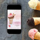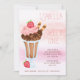 Sorvete para um doce! Um design bonito e bonito para a legal festa de aniversário de verão da sua menina. A design tem um sundae sorvete com colheres de morango e sorvete de chocolate, bolinhos de wafer, molho de chocolate e metades frescas de morango. Tem um fundo de lavagem a aquarelas num raio solar tropical, cor-de-rosa e pêssego, com tipografia química.