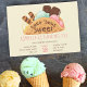 Taco sobre o Sorvete doce - perfeito para a legal festa de aniversário de verão da sua menina. O modelo está pronto para você personalizar para qualquer festa de aniversário etária. O design tem um sorvete de taco cheio de bolos de wafer, sanduíches de sorvete e colheres de sorvete em sabores de morango, menta e baunilha. O taco é marcado com a expressão "taco 'bout doce" em letras bonitas de mão. A carta tem um fundo de baunilha com tipografia rosa e chocolate e um padrão de waffle no verso.