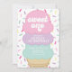 Doce Um! convite de festas de primeiro aniversario e aspersor, com sorvetes cor-de-rosa, roxo e turquesa e aspergaminhos arco-íris.