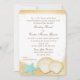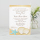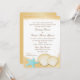 Dourados conchas e peixes-estrelas aqua enfeitam a margem ouro deste convite de casamento bonito na praia. Personalize o texto como preferido.
