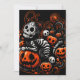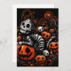 Mergulhe no estranho encanto do Dia das Bruxas com esta imagem impressionante que apresenta um gato esquelético estrelado sobre uma abóbora, rodeado por pequenos picos de lanternas e crânios. A paleta de cores preta e laranja, realçada com ossos brancos, captura perfeitamente a essência assustadora, porém brincalhona, das festividades de outubro, fazer-a a escolha ideal para decoração sazonal ou eventos temáticos.