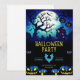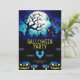 Junte-se a nós por uma noite de diversão terrível sob a lua de cheio! Este convite para festas de Halloween atmosférico é perfeito para estabelecer um humor assustador clássico. A design apresenta uma cena maravilhosamente estranha com uma casa assombrada e uma árvore mastigada e assustadora silenciada contra uma lua gigante e brilhante. Os morcegos voam através do céu noturno estrelado, e as lanternas-de-jack-o-lanternas pendem dos galhos. A parte inferior do convite é guardada por um pedaço de abóboras azuis brilhantes e algumas aranhas assustadoras e rastejantes, convidando convidados para uma celebração verdadeiramente assombrada.