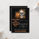 This bold and festive Halloween invitation features a spooky skull and smiling jack-o’-lantern surrounded by fall leaves and flowers — the perfect mix of eerie and fun. The orange textured lettering pops against the black background, creating a hauntingly stylish invite for your celebration.