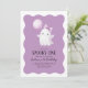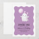 Spooky One! O convite para primeiros aniversarios de moça com fantasma giro com balão roxo em fundo ondulado. O convite perfeito para o primeiro aniversário para a sua festa de aniversário!