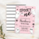 Uma festa de halloween não tão assustadora! Pastel rosa Spooky One Ghost Halloween convite com fundo de faixa branca e preta.