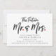 Este convite festa de noivado contém as palavras "o futuro Sr. & Sra." em um moderno roteiro manuscrito preto com um padrão cardíaco vermelho e rosa no verso.