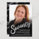 Setenta caracteres em negrito em cor prateada e preto. Personalize este convite de aniversário de fotos do script de festa de aniversário com seus próprios detalhes de evento de festa de aniversário e fotos de sua aniversariante. Estão disponíveis outros anos e uma versão em folha e itens correspondentes. © Original graphics design por Sarah Trett para www.mylittleeden.com no Zazzle.