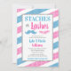 As estacas ou as chicotadas do gênero revelam convites de festas. Um design bonitinho com bigode e pestanas, com brilho azul e rosa sujo. Seus hóspedes vão adorar este tema divertido! Personalize facilmente com seus detalhes de eventos.