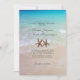 O mar azul e a areia da praia são a imagem de fundo neste convite para casamento na praia com dois estrelas-do-mar representando o casal. A noiva e o noivo estão convidando convidados com o texto "por favor, juntem-se a nós" - ou mudem-no como quiser. Estilo de fonte impresso com nomes no script. O reverso também tem uma cena de praia.