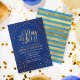 Elegante convite para Chás de fraldas com uma borda de estrelas e as palavras "É um menino" em folha de ouro falsa contra uma vibrante cor azul de fundo aquoso. O cartão tem um padrão de tiras de folha de ouro inverso em relação a um fundo de cor azul-clara de água. Personalize-o substituindo o texto do marcador de posição para adicionar suas informações. Para obter mais opções, clique no botão "Personalizar". *Observe que a Marca d'água do Zazzle que aparece na visualização de zoom NÃO aparecerá no produto impresso final. © Rosewood e Citrus