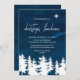 Esta carta de convite para o almoço de Natal é perfeita para um evento de feriado religioso. A design apresenta uma cena de floresta de inverno com um céu a aquarela marinho e uma estrela brilhante de Belém.