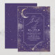 Encantador e místico convite de chá de fraldas roxo, com lua crescente, estrela cadente e galáxias.