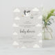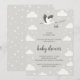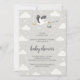 This invitation features a whimsical sky theme with gentle gray tones and playful stork illustrations. A charming stork carrying a baby bundle flies across the top, surrounded by fluffy clouds and scattered stars, creating a dreamy, storybook feel. The mix of handwritten-style script and clean, simple fonts adds warmth and personality, while the neutral gray and white palette keeps the design modern, elegant, and perfect for a sweet baby boy celebration.