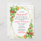 This fun and whimsical baby shower invitation features watercolor strawberries, daisies and foliage on a gold geometric frame. The text combines handwritten script and serif fonts for a stylish and modern look. This is perfect for a summer rustic baby shower.