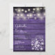 Um convite de casamento na moda rústico com luzes de cordas bonito e jarras de pedras. Os nomes dos casais felizes são colocados em um roteiro elegante acima dos detalhes especiais do casamento em um fundo de madeira roxa rústica. O reverso apresenta um fundo de madeira roxa russa correspondente. Projetado por Thisnotme©
