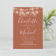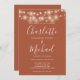 O convite de casamento Elegante do terracotta com luzes de cordas bonito e nomes de estilo de assinatura, este convite de casamento de na moda pode ser personalizado com suas informações em letras brancas chic. Projetado por Thisnotme©