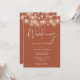This elegant script terracotta wedding invitation, featuring pretty string lights, can be personalized with your information in chic typography with your wedding website details and your QR code on the reverse. Designed by Thisisnotme©