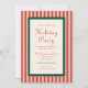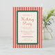 This holiday party invitation is simple yet festive and features a red and pink striped background with a dark green scalloped border. The design is perfect for inviting guests to your Christmas, New Year's, or winter celebration.