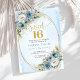Perfect for elegant, modern, or garden-inspired parties, the harmonious mix of dusty blue, white florals, and greenery creates a timeless look that feels both youthful and upscale. The gold frame adds a subtle touch of glamour, making this design ideal for formal Sweet Sixteen events, evening celebrations, or classy birthday themes. The balanced layout ensures party details are easy to read while maintaining a polished, photo-worthy presentation.