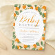 Este convite para chás de fraldas de laranja giro apresenta laranjas de citrinos em vinhas de folha verde com flores brancas em fundo de laranja pastel. Uma letra moderna de escrita de caligrafia adiciona um toque de capricho a este doce convite de chá de fraldas de verão.
