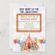 Suba! Convite de aniversário de circo, pequenos animais bonitinhos na frente de uma tenda de circo, prontos para comemorar