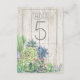 Fontes únicas, suculentas coloridas em aquarela e fundos de tábuas de madeira rústica são os destaques destes produtos de casamento para combinar. Este belo cartão de número de mesa tem bordas de folhagem nos cantos em um fundo branco com um modelo fornecido para editar números. O produto é espelhado no verso. Procure ID515 para ver todos os produtos correspondentes neste conjunto.
