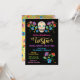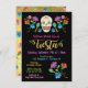 Convites de chá de panela mexicanos coloridos e bonito de FIesta. Pode mudar a redação para qualquer evento temático Fiesta. Características desenhadas à mão em flores bordadas, crânio de açúcar e maracas em fundo preto. Tipo de letra de folha de ouro e de trás. Ilustração desenhada à mão por McBooboos. Bordados falsos e folha de ouro, este é um desenho