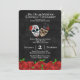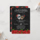 Arrecadações de fundos divertidas e festivas Convite com um casal de crânios de açúcar vintage. As rosas vermelhas decoram a parte inferior do convite, bem como o padrão no verso do convite. Projetado para um evento no dia 2 de novembro ou por volta desse dia, quando o Dia de los Muertos é celebrado. Uma oportunidade de fortalecer sua comunidade com uma atividade divertida.