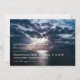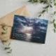 Um memorial ou um convite para comemoração da vida que inclui uma fotografia do sol a partir-se através de nuvens de chuva sobre o oceano.