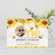 Abelhas e girassóis escolheram o primeiro convite de aniversário da foto da menina. Este primeiro convite de aniversário apresenta um arranjo floral de girassóis, palavra de aquarela amarela e abelhas. A design também apresenta uma colmeia, um padrão de pente de mel e linhas de trajeto de mosca em forma cardíaca.