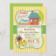 Casa doce, colorida, doce, convite de festas de lar, com um padrão de listras amarelas e brancas. As feições são casadas com chaminés e portas do coração, árvore, cerca de piquete, flores, girassóis e uma casa de pássaros. As cores incluem amarelo, verde limão, vermelho, lacrimejo, rosa, marrom, laranja e branco. Bem-vindos aos seus amigos e família à sua nova casa com este convite fofo.