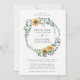 Estes convites de casamento apresentam um design floral de aquarela com girassóis e folhagem de folhas de eucalipto. Personalize com seu texto. Material de papelaria correspondente também disponível.
