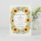This elegant wedding design features a rich sunflower wreath framed with soft greenery and subtle red berry accents on a light neutral background. Inspired by rustic farmhouse and boho garden weddings, the warm yellow florals create a joyful yet refined aesthetic. The symmetrical floral arrangement adds balance and romance, making it ideal for fall, summer, or country-style wedding celebrations with a natural, timeless feel.