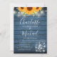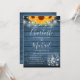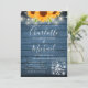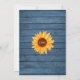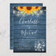 Um convite de casamento na moda rústico com flores solares bonito, luzes de cordas, frascos-pedras, nomes de estilo de assinatura e tipografia quic num fundo azul de madeira rústica. O reverso apresenta as iniciais do seu monograma num girassol correspondente. Projetado por Thisnotme©