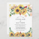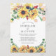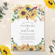Estes convites para casamento de cor de girassol apresentam um design de girassol de cor d'água com folhas de eucalipto, folhas de outono, frascos de pedras e luzes de cordas. Personalize-os com o seu texto. Produtos correspondentes disponíveis.