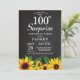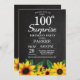 Surpresa de Girassol 100º Convite de aniversário. Flores Florais e Fundo Chalkboard. Retro de Vintagem do País. Mulheres Aniversário. 15 de 12 de 16º 20 de 18º de 13 21rua 30 de 40º de 50º de 60º de 70 90 de 100º de qualquer idade. Digital Imprimível. Para mais personalização, clique no botão "Personalizar" e use nossa ferramenta de design para modificar este modelo.